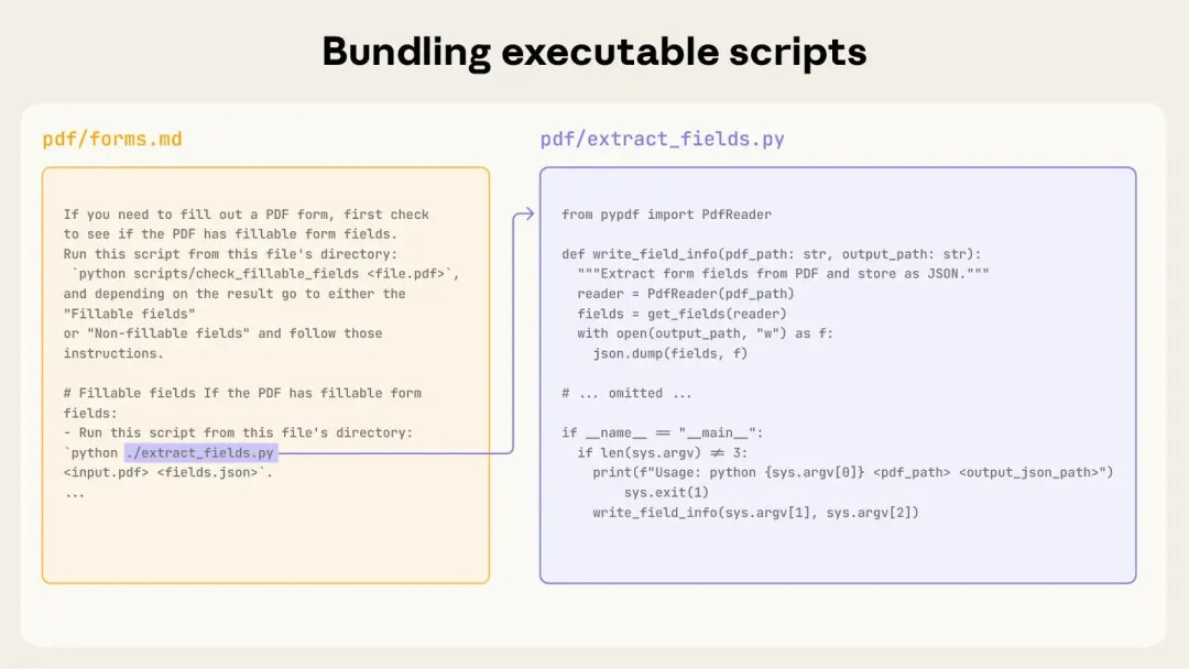 比如 PDF skill 里就有个 Python 脚本,专门用来提取表单字段。Claude 直接运行脚本就行了,又快又准,还不占用上下文窗口!