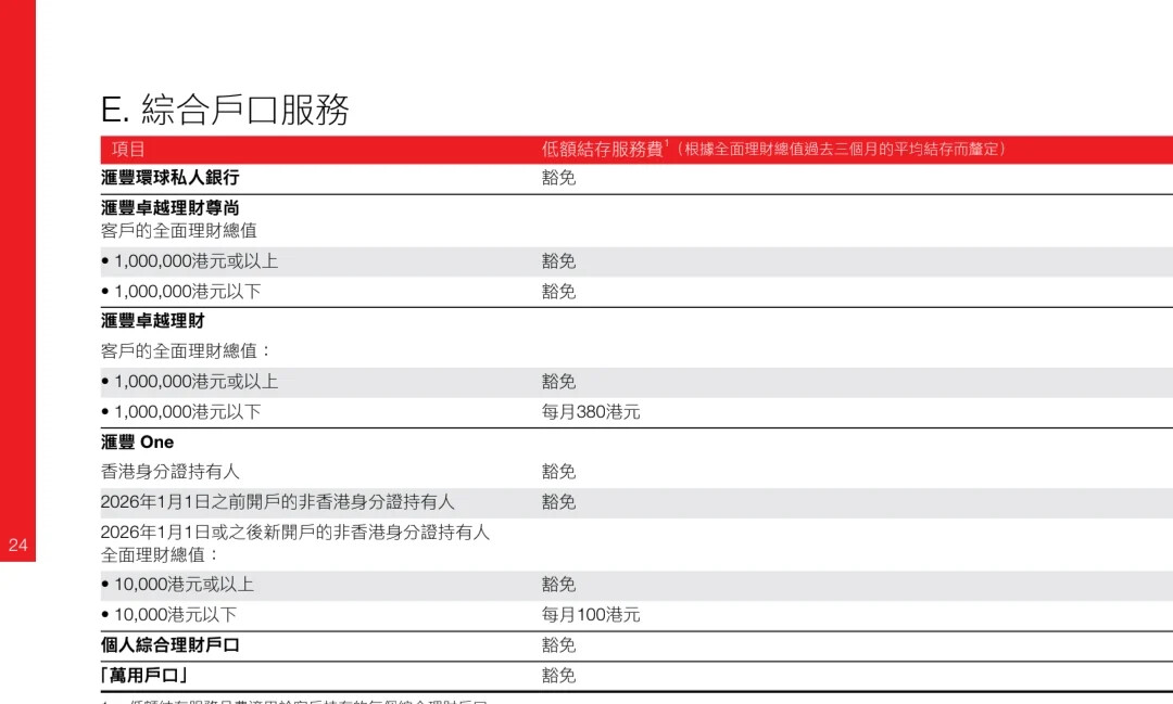 年新开户、无香港身份证的客户,如果理财总值低于1万港元,每月需缴纳100港元服务费