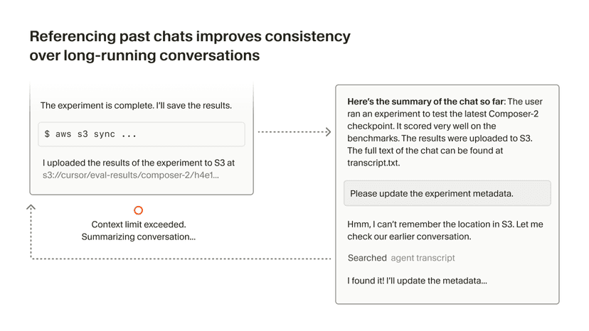 但由于这是对上下文的有损压缩,Agent 的掌握情况在摘要之后可能会变差,可能会忘记任务中的关键细节。在 Cursor 中,我们将对话历史作为文件提供,以提升摘要的质量。