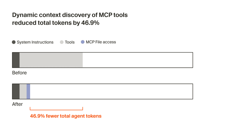 Agent 现在只会收到一小段静态上下文(包括工具名称),并在任务需要时再去查找具体工具。在一次 A/B 测试中,我们发现:在会调用 MCP 工具的运行中,这一策略 将 Agent 的总 token 消耗减少了 46.9% (这一结果在统计上显著,但会随已安装 MCP 的数量产生较大波动)。