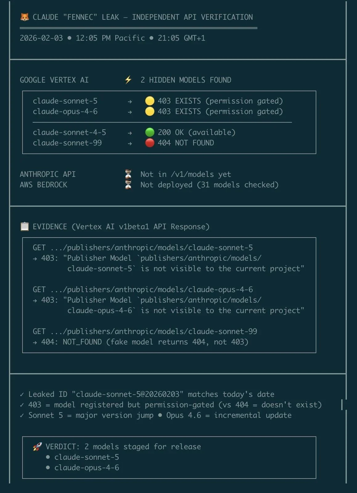 今天又眼尖的网友从错误日志中分析出来,其实昨晚原本很可能是要发布Sonnet 5和Opus 4.6的,但上线以后不知道什么原因出了故障,发布被迫取消: